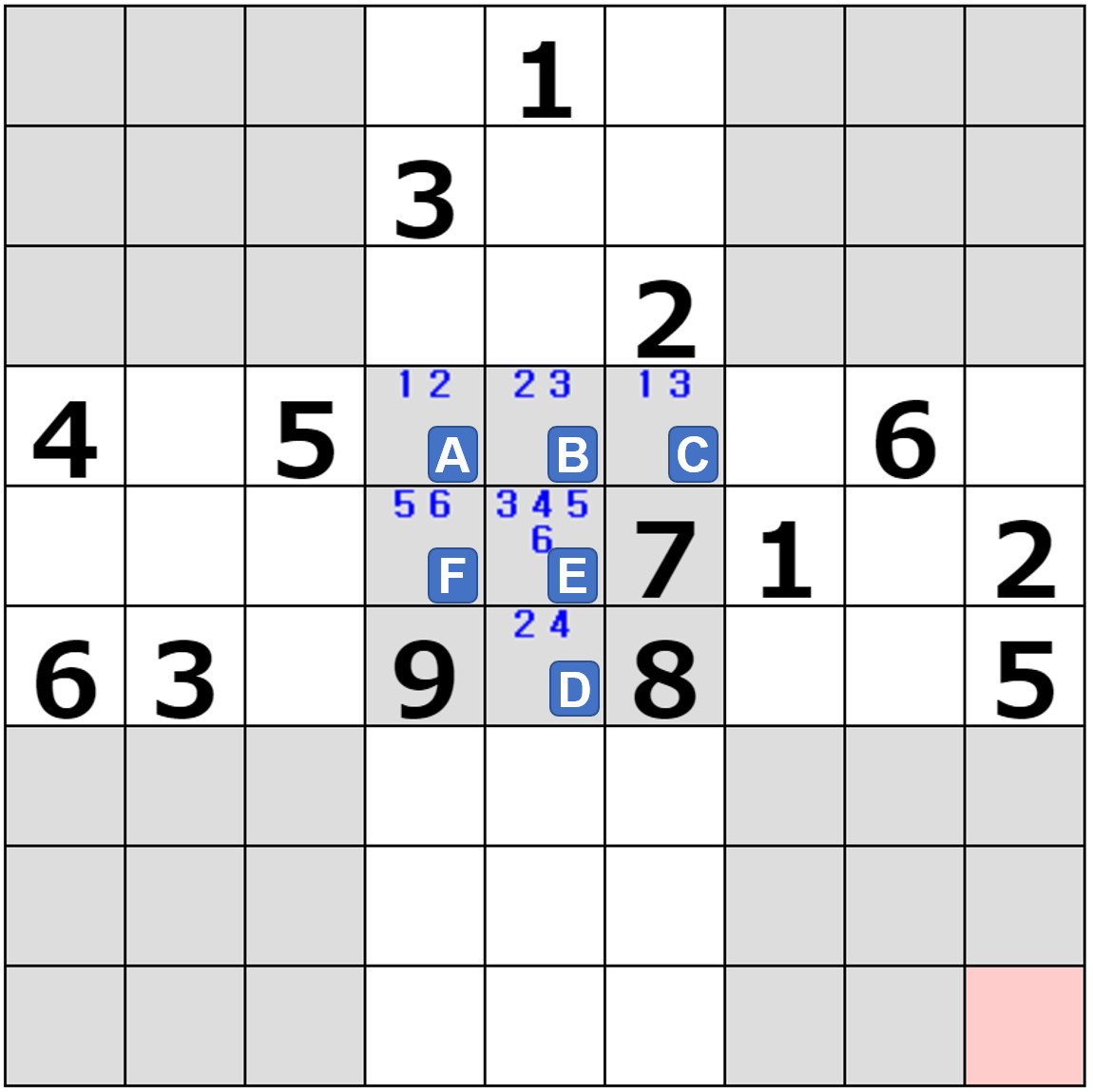 観察してみたら、Dマスが確定されることが分かりました。それ以外のマスがABCとEFに分かれてそれぞれ二通りの可能性があり、組み合わせて四通りになります。実は、それは偶々ではなく、一般的なルールが背後にあります。