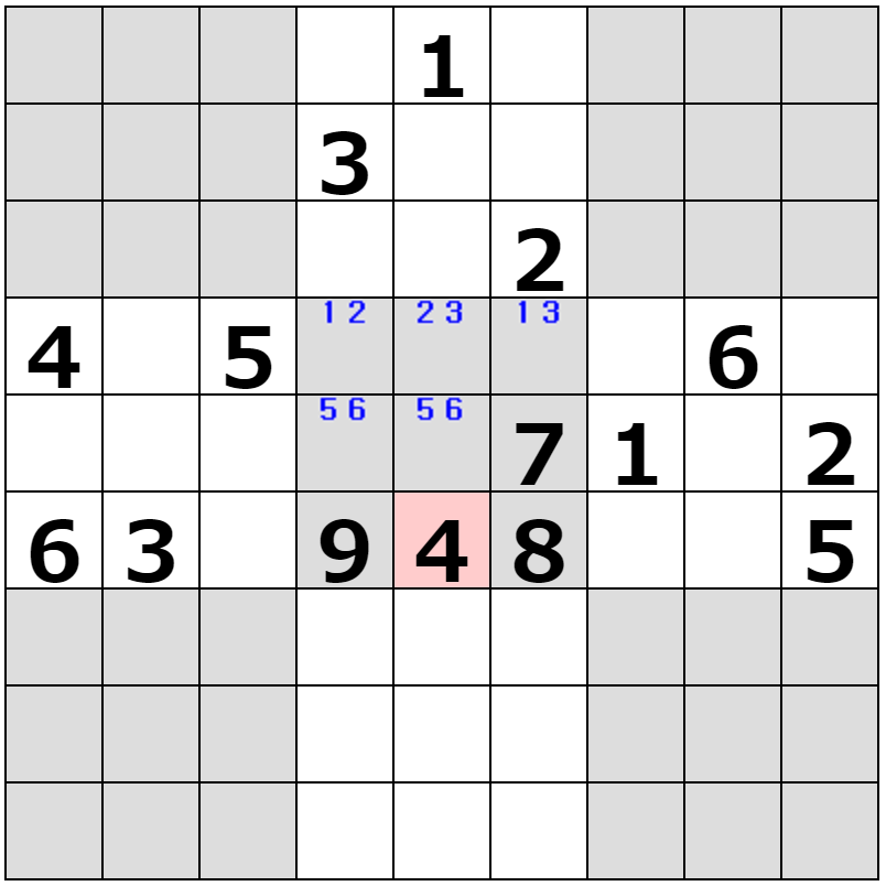冒頭の数独問題に戻りますと、候補を以下のように絞り込むことができました。「仮置き」をしなくても。