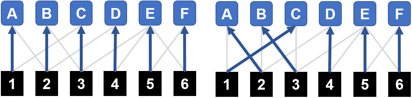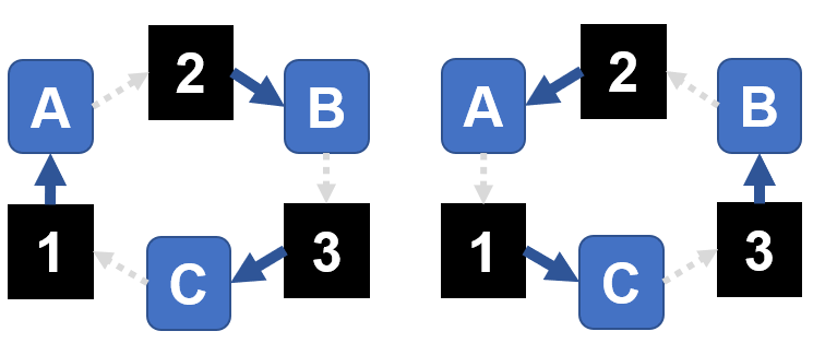 まず、マスABCと数字123の接続構造を考えてみましょう。A=1,B=2,C=3という繋がりでしたら下左のようになりますが、対称的にA=2,C=1,B=3というのも可能です。下右の図で表します。