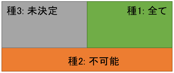 数独問題を解く際、もしあるマスに必ずある数字が入ることが分かったら、それが嬉しいに間違いありません(種別1)。一歩譲って、もしあるマスにある数字が入ることが不可能だと分かっても、それも嬉しいでしょう(種別2)。残りはまだ決められないマスと数字の組み合わせです(種別3)。