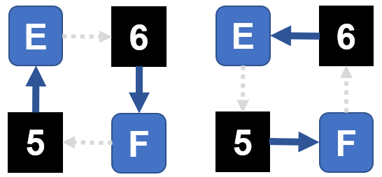 可能な解(接続線六本)をまず一つ見つけて、選んだ接続線を青色で塗って上向きの矢印を付けます。選ばなかった線はそのまま灰色で下向きの矢印を付けます。そうすると、マスもしくは数字から、接続線に沿って他のマスもしくは数字にたどっていくことか可能になります。それを「パス」と呼びましょう。例えば、D→2→B→C→1→A。さらに、出発点と終点のみが同じパスを「サイクル」と呼びます。例えば、E→6→F→5→E。