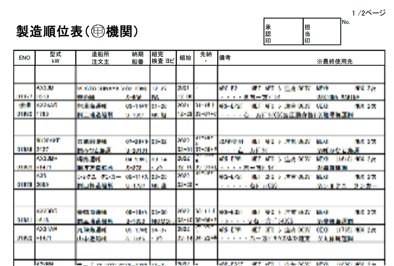 西 その通りです。エンジンの部品が全て完成したら、組立を始め、 機関台でテスト運転を行い、完了したら一部の部品を取り外して出荷となります。 機関台の数には限りがあり、それぞれ運転可能なエンジンの機種も異なります。一つの機関台の占有期間が長引くほど年間の製造台数も減少し、工場全体の生産性・利益も下がってしまうので、受注状況に応じて効率的な機関台のスケジュールを決めることが求められます。