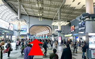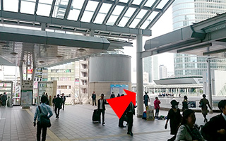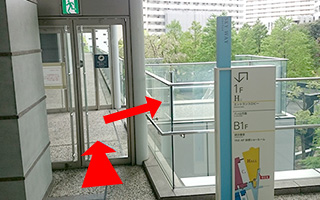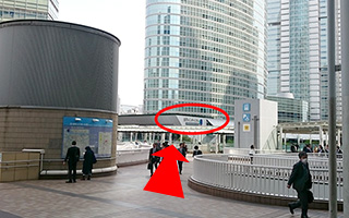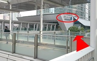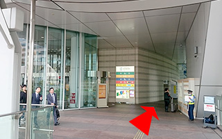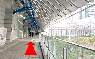 1JR品川駅の改札口を出て、港南口(東方向)へ向かってください。平坦な長い通路があります。反対側の高輪口(すぐに階段/エスカレーター/エレベーターがあります)へ下りてしまわないよう、お気を付けください。京急品川駅で降りた場合は、外へ向かわず、まずはJR改札口へ上がってください。