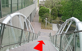 10階段を下りて、ビルに沿ってその先のスロープを進みます。