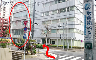 14歩行者用の押しボタン式信号を渡ってください。ボタンを押せば信号がすぐに変わります。目の前の2棟のビルのうち、左側がゴールの「コーストライン品川ビル」です。