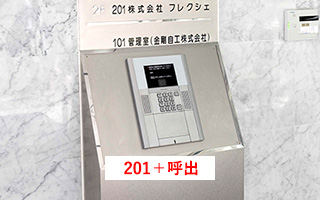 16インターフォンで「201」の後に呼出ボタンを押してください。弊社スタッフが応答し、リモート操作で内ドアを開けます。