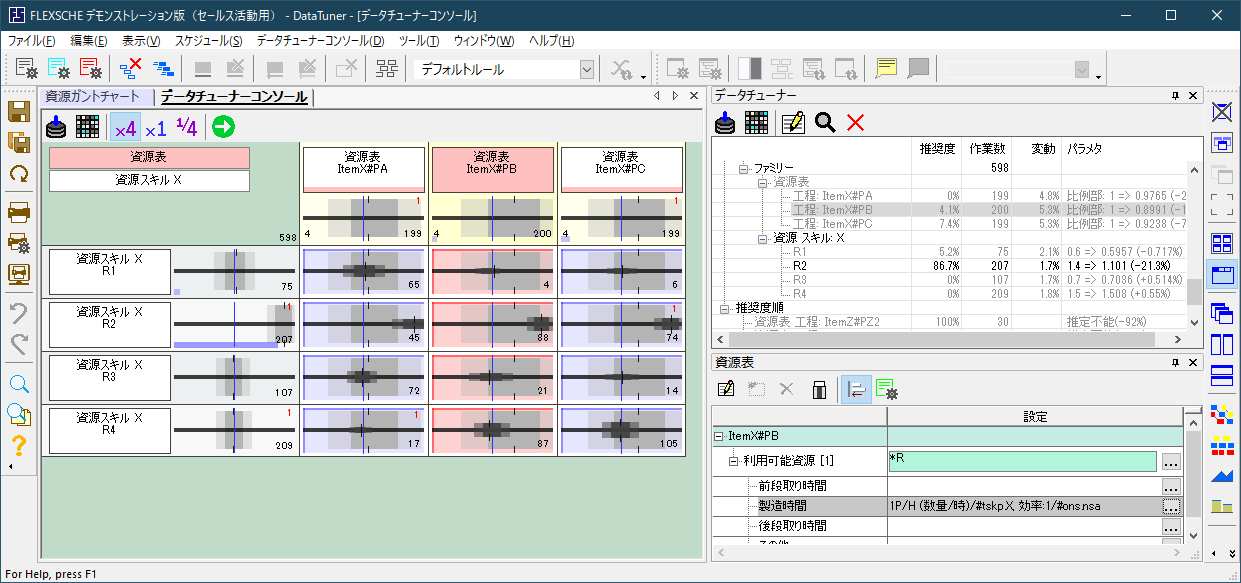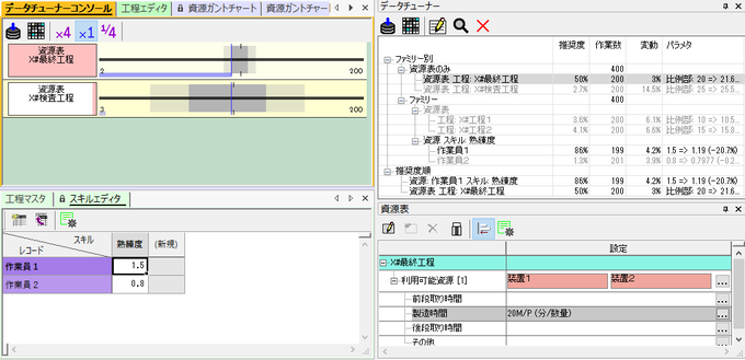 生産する数量に比例して時間はかかるとか、数量にはよらないが人によって作業時間は変わる、などあらかじめ作業時間が単純なモデルで算出できる場合はデータチューナー機能を使用することができます。