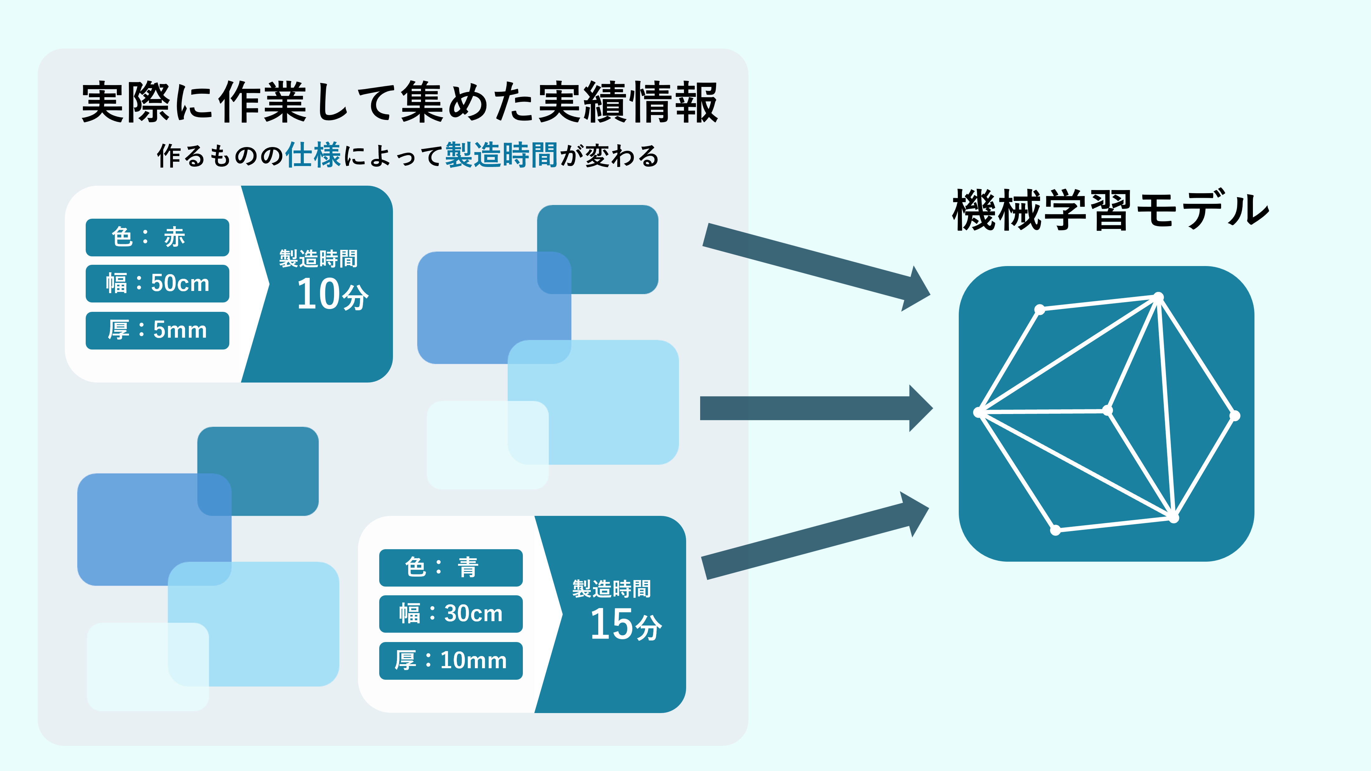 実際に作業を行った時の諸条件と掛かった作業時間を機械学習モデルに与えることで条件によって作業時間がどのように変化するかを学習します。