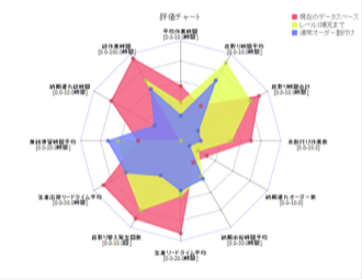 予め標準で用意されている以下の評価指標のためのレーダーチャート(「評価チャート」と呼ぶ)を簡単に作成できます。複数のスケジューリング結果を重ね合わせることもできますので、スケジューリングルールのチューニングに利用できます。