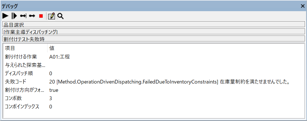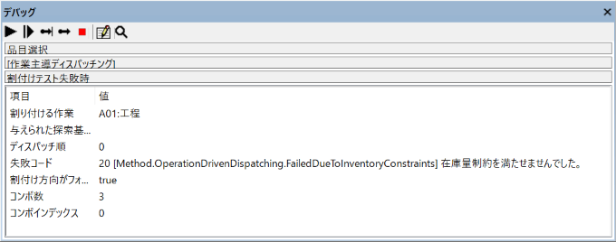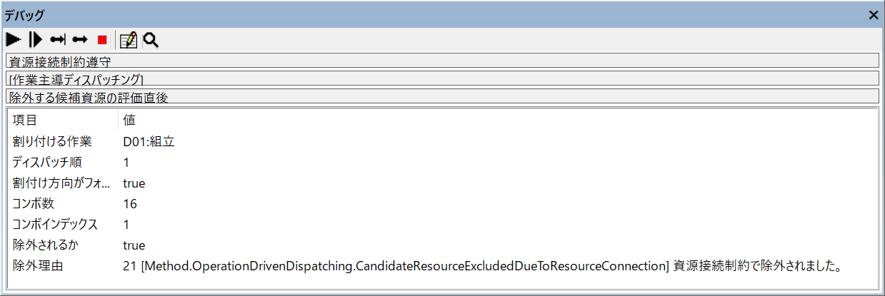 作業主導ディスパッチングメソッドのブレイクポイントに「除外する候補資源の評価直後」を追加しました。 除外理由等、判定時の様子を確認することができます。