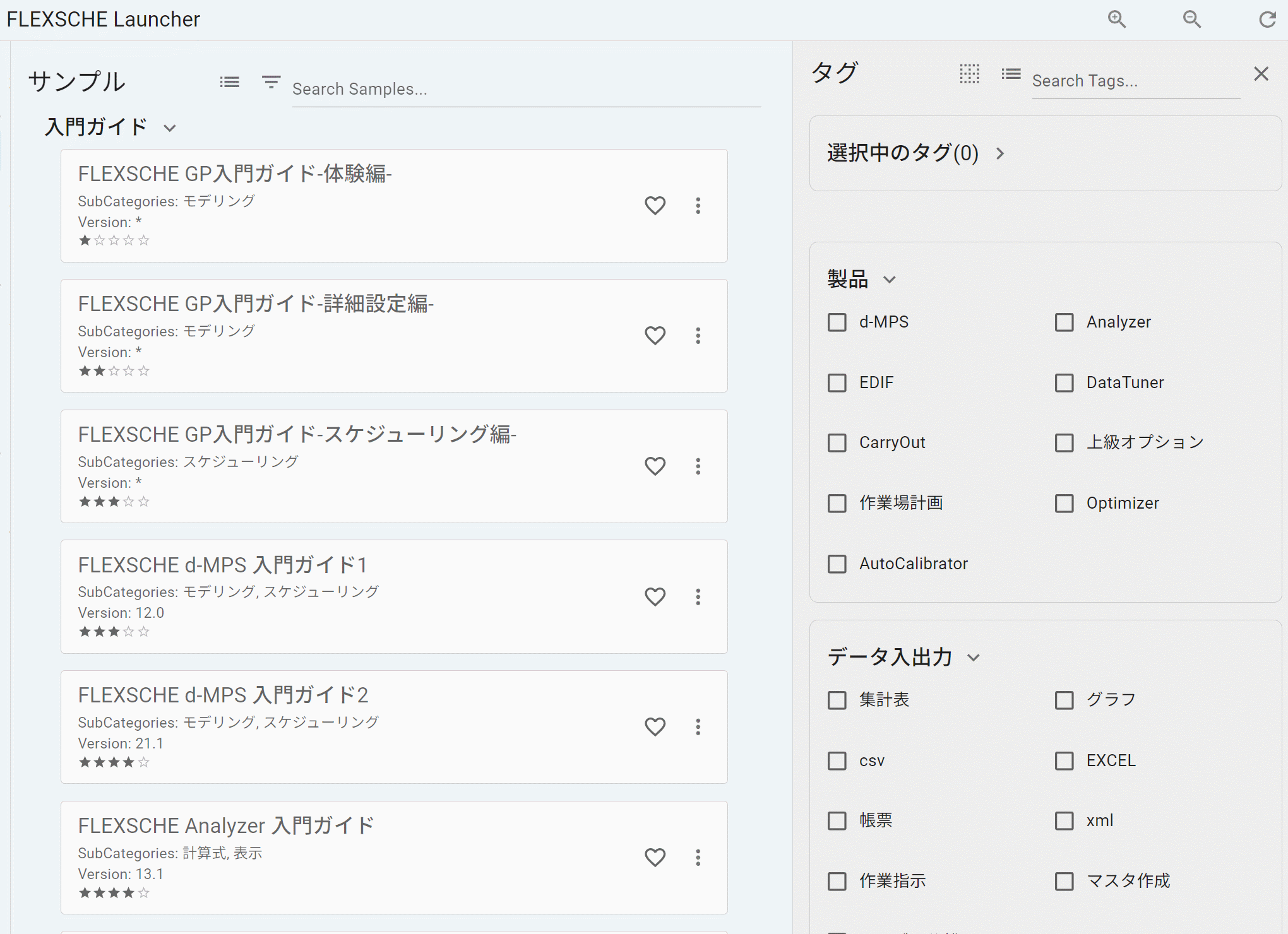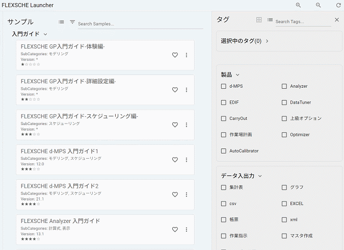 FLEXSCHE ランチャーのリニューアルに伴い、サンプルページを大幅に拡充しました。タグが追加され、絞り込みが可能になりました。 また、テキスト検索による絞り込み機能も搭載されています。さらに、★から★★★★★までの5段階の難易度が追加されました。 加えて、Readmeの確認やタグの切り替えも可能で、利便性が向上しています。