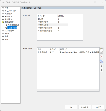 作業主導ディスパッチングメソッド実行中のいくつかのタイミングで計算式を実行できるようになりました。 これにより従来と同等のことが、よりシンプルな計算式で効率的に実現できるようになりました。 たとえば、品目ごとに1日にあたりの製造上限数が決まっている場合などに有効です。 従来であれば、作業を割付けるたびに当日の製造数をその都度再計算する必要がありました。 しかしトリガー処理を利用すれば、品目の製造数に変化があったタイミングで当日の製造数を更新・記録できるようになるため、作業を割付ける際の再計算が不要になり、より効率的な処理となります。