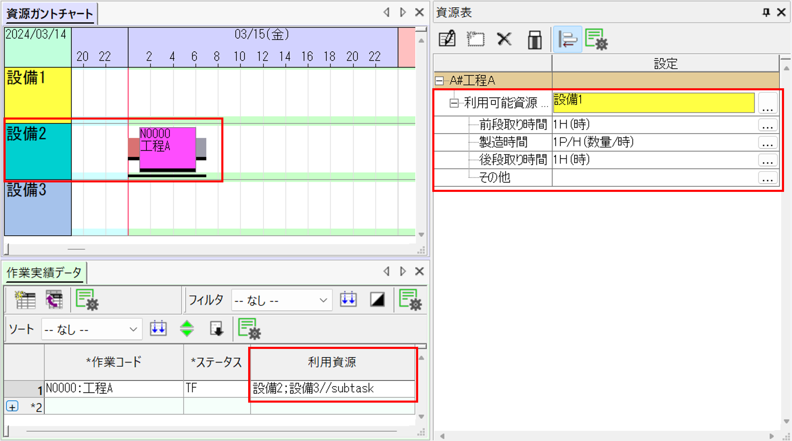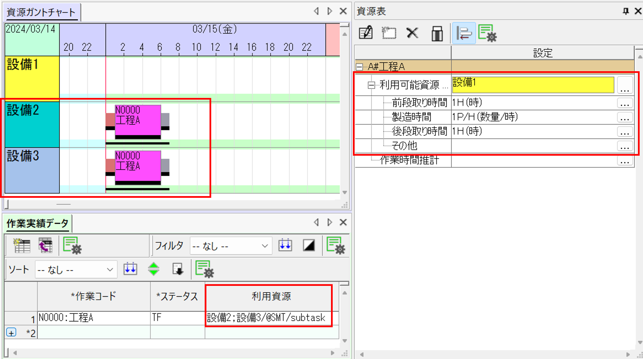 これにより、例えば段取りパートに人手が必要な場合でも実際の業務フローに沿ったかたちでモデル化できるようになります。副資源の稼働状況をより現実的に反映することで、計画の精度と実行可能性が一層向上します。