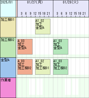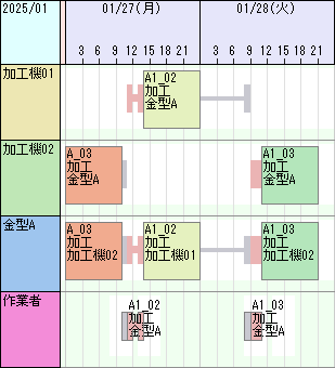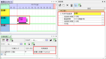 副資源上の先行作業や後続作業によって段取り時間を変えることができるようになりました。 例えば、機械に金型を取り付けて作業し、機械に金型を取り付ける際や取り外す際には段取りが発生するような場合に、機械上では金型が変わっていないように見えてもその間に別の機械上でその金型で作業する場合には金型の付け替えの段取りが必要です。これを簡単に表現できるようになりました。