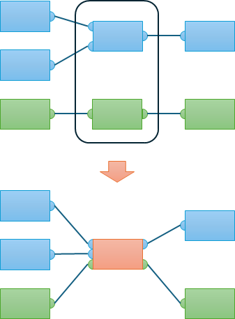 元の作業の入出力リンクは、全てそのままクラスター作業に継承されます。また、タスク構成については、合成方法を指定することができます。 例えば、複数のワークを重ねた状態で行う「共加工」作業を単純資源上で実施するような場合、それらをクラスター作業として束ねることでスムーズにスケジューリングできます。 また、バッチ炉での1バッチの作業構成を明示的に指定したい場合にも、クラスター作業として定義すれば簡単です。