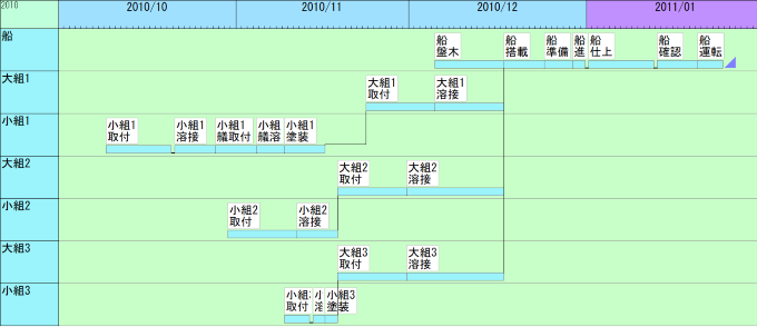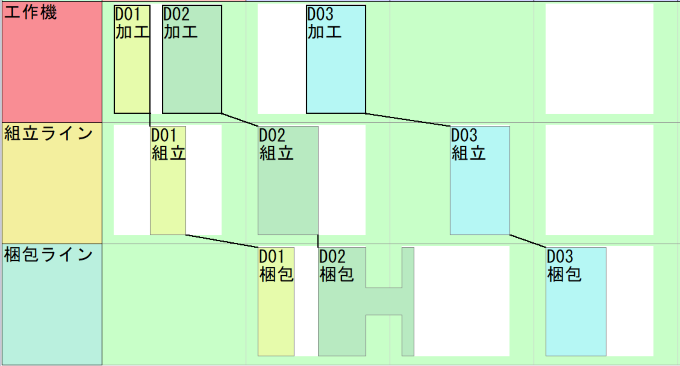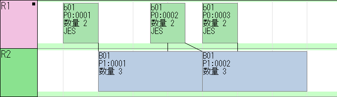 オーダーガントチャートにおいて、異なる行にまたがる接続線も表示可能になりました。 これにより、オーダーガントチャート上での引当て関係が、より簡単かつ明瞭に表現できるようになりました。