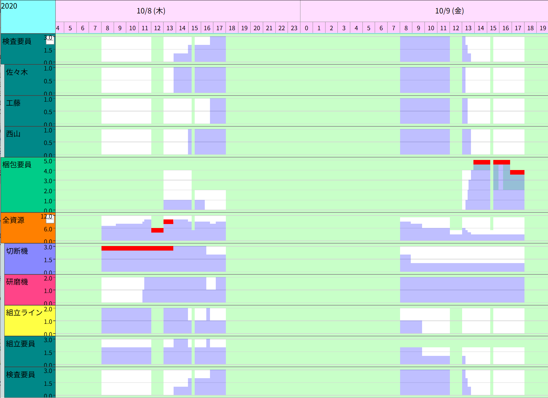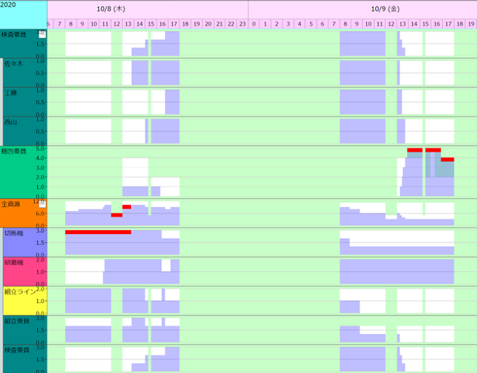 WebViewerでも負荷チャート行を利用できるようになりました(無集計資源量のみ)。 各資源の負荷を直感的に把握するのに便利です。負荷オーバーしている区間についてはアラートで表示されます。
