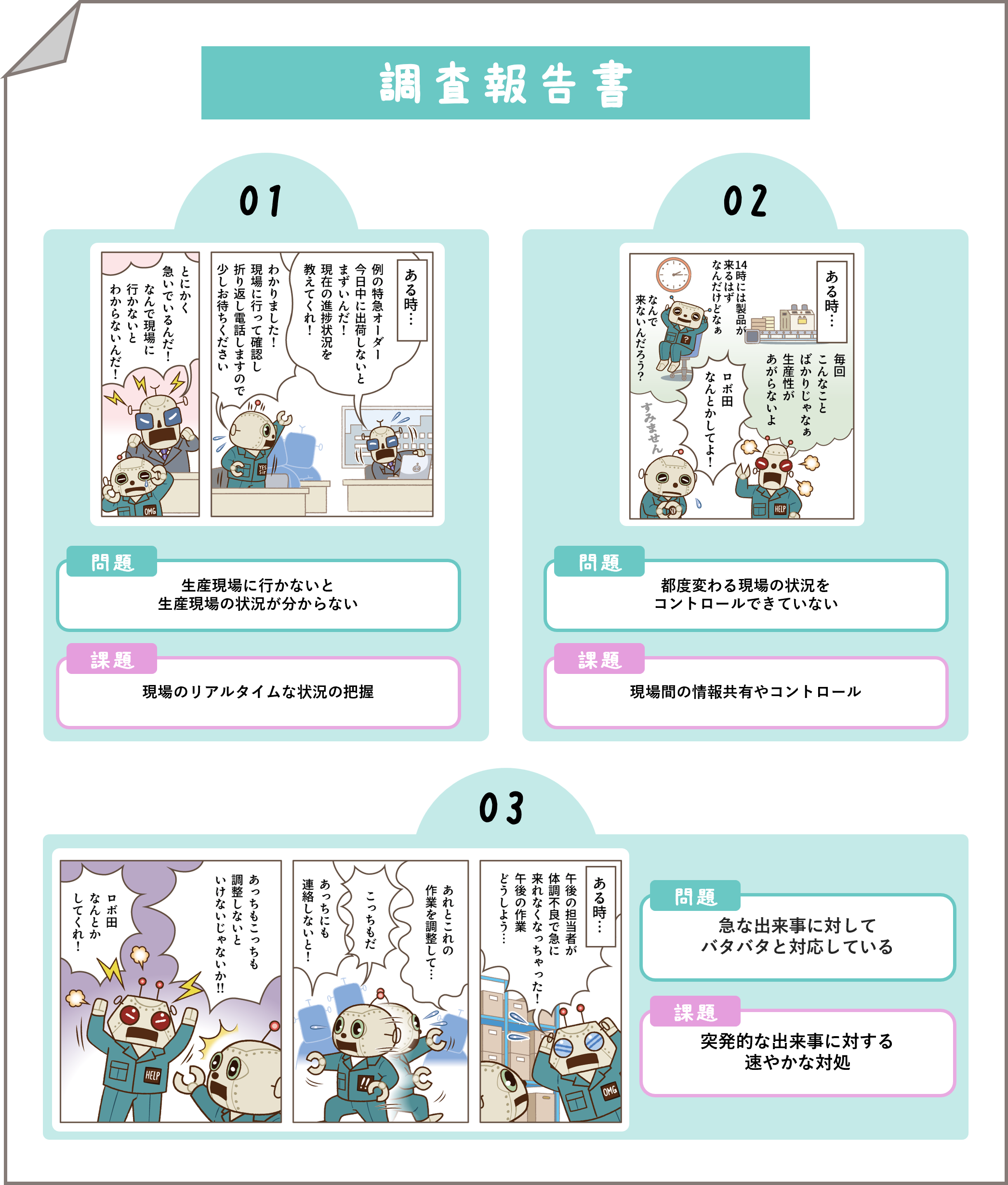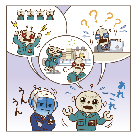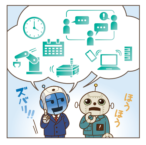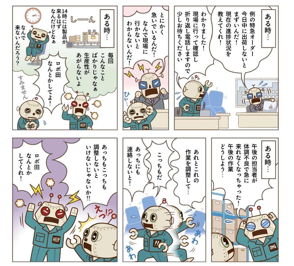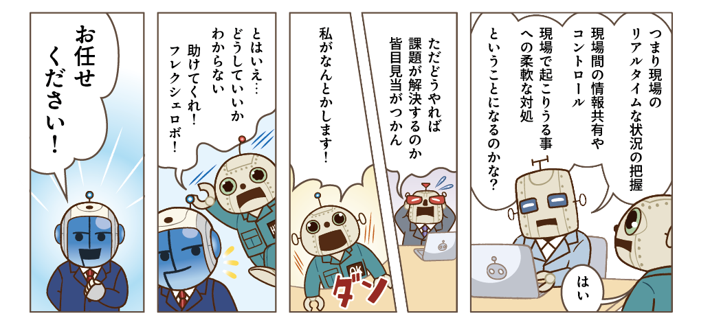 「こんなことが現場で起こっているんです。なんとかできないですか?」ロボ田は、調査を進める中で見えてきた工場内の状況や課題をフレクシェロボに打ち明けました。