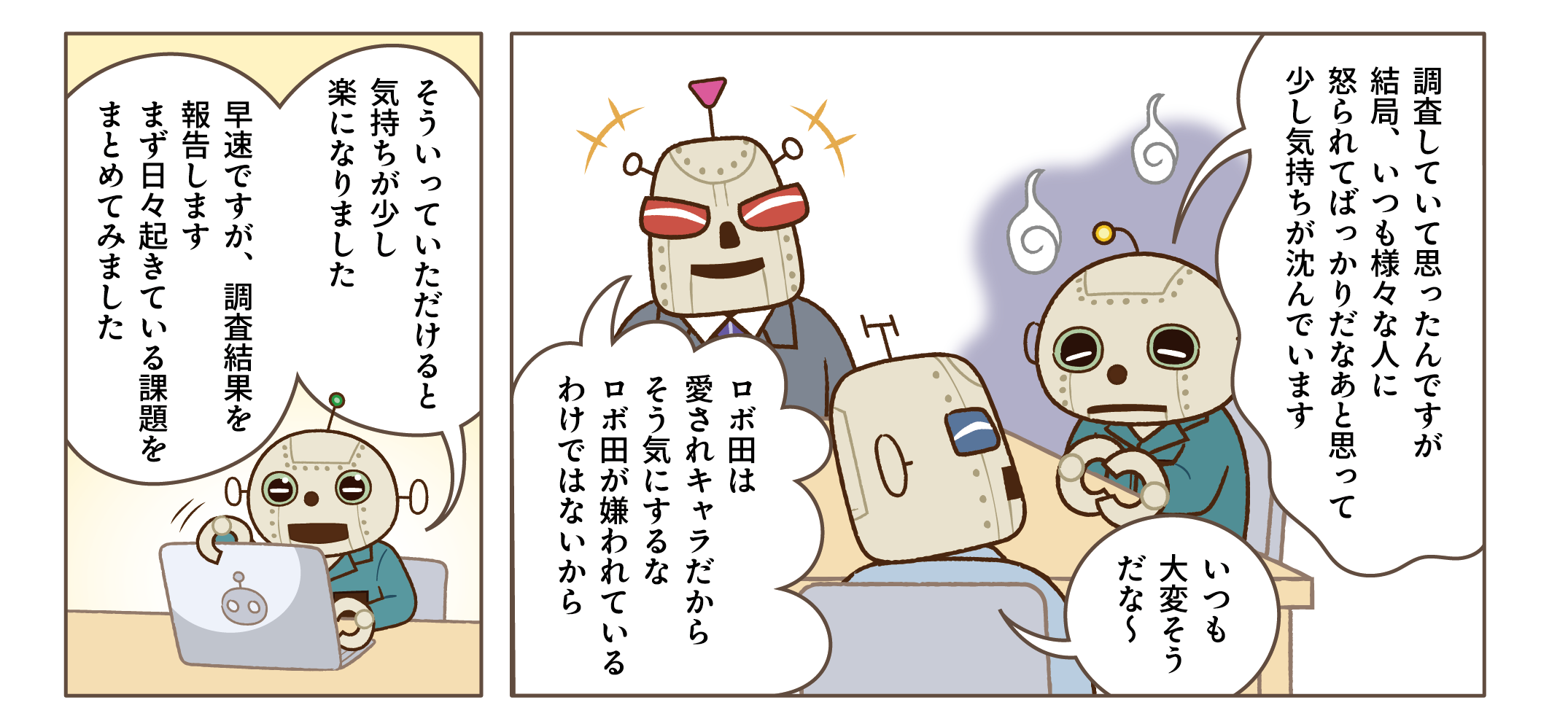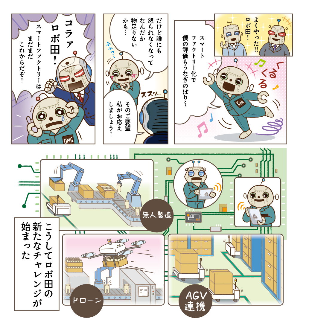 工場長や課長に褒められたい一心で、つい「なんとかします!」なんて勢いで答えてしまったロボ田。しかし、何をどうすれば良いのか全く見当がつかず、焦る中で頼れる相手としてフレクシェロボを思い出します。