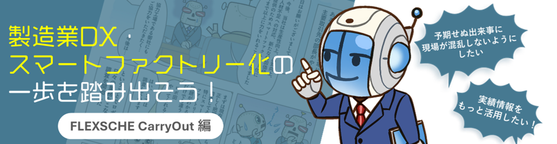 「大丈夫です。」フレクシェロボは力強く言いました。「FLEXSCHE CarryOutを使えば、これらの課題も解決できます。一緒にスマートファクトリーへの第一歩を踏み出しましょう。」FLEXSCHE CarryOutなら、計画に基づいたものづくりの“遂行”までサポートしてくれるというのです。その言葉を聞いて、ロボ田はなんだかFLEXSCHE CarryOutを使えば、工場内の課題が解決できるかもしれないという気がしてきました。