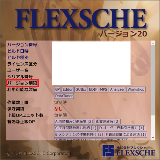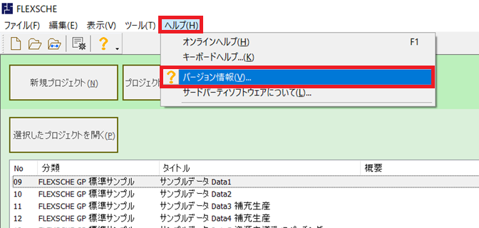 【3】FLEXSCHEを起動し、[ヘルプ]から[バージョン情報] を開き、ライセンス内容が更新されていることをご確認ください。