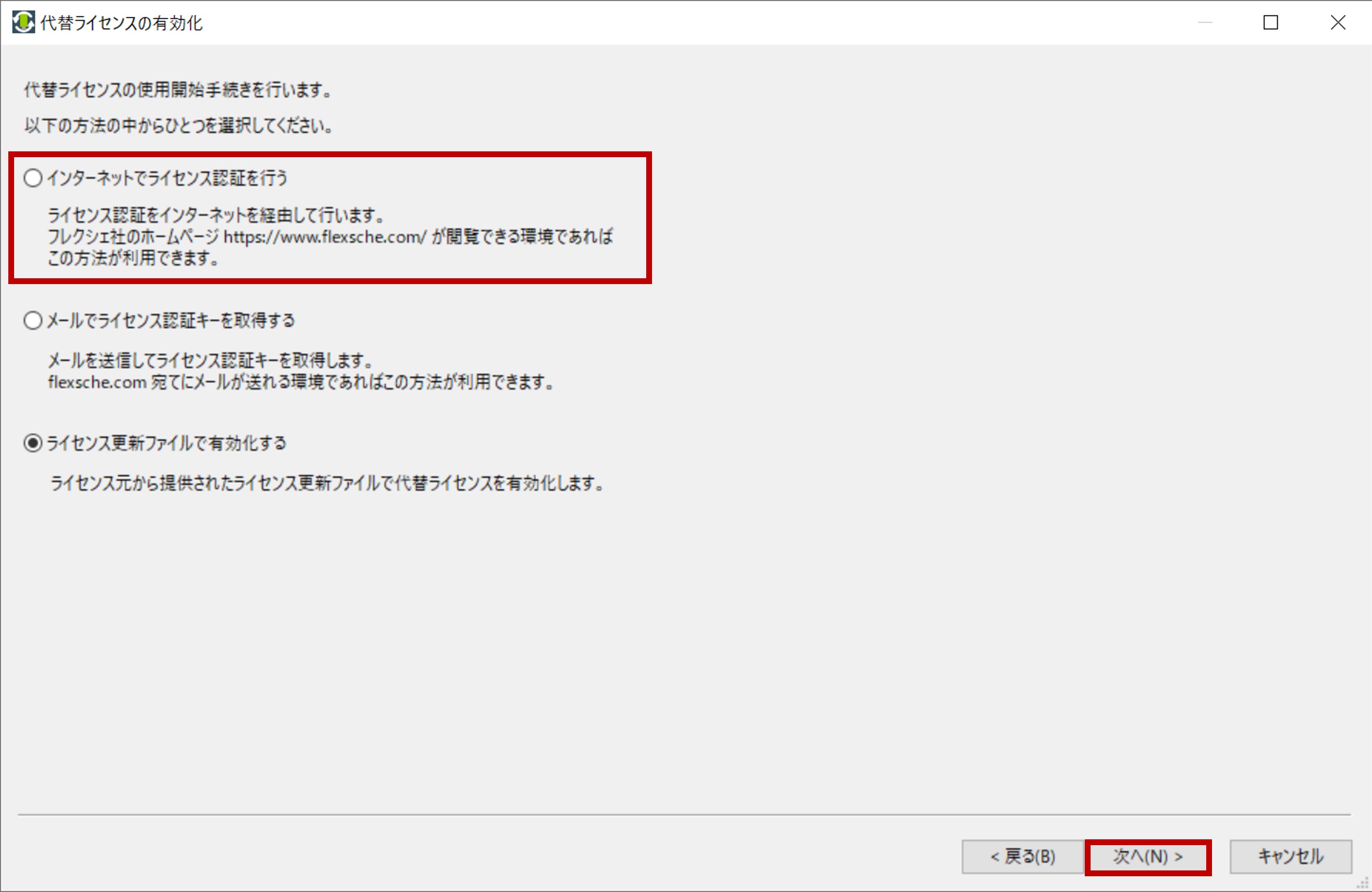 [ライセンス更新ファイルで更新]を選択し、[次へ]をクリックしてください。