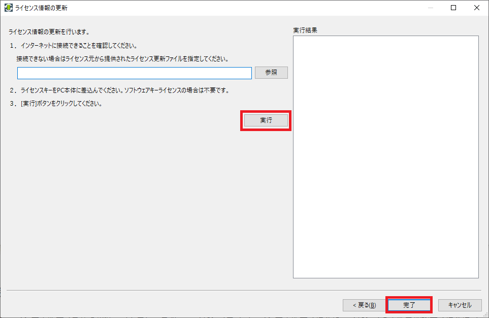 [参照]からライセンス更新ファイルを選択し、[実行] ボタンをクリックしてください。 [完了]ボタンをクリックし、ライセンスキーアップデーターを終了してください。