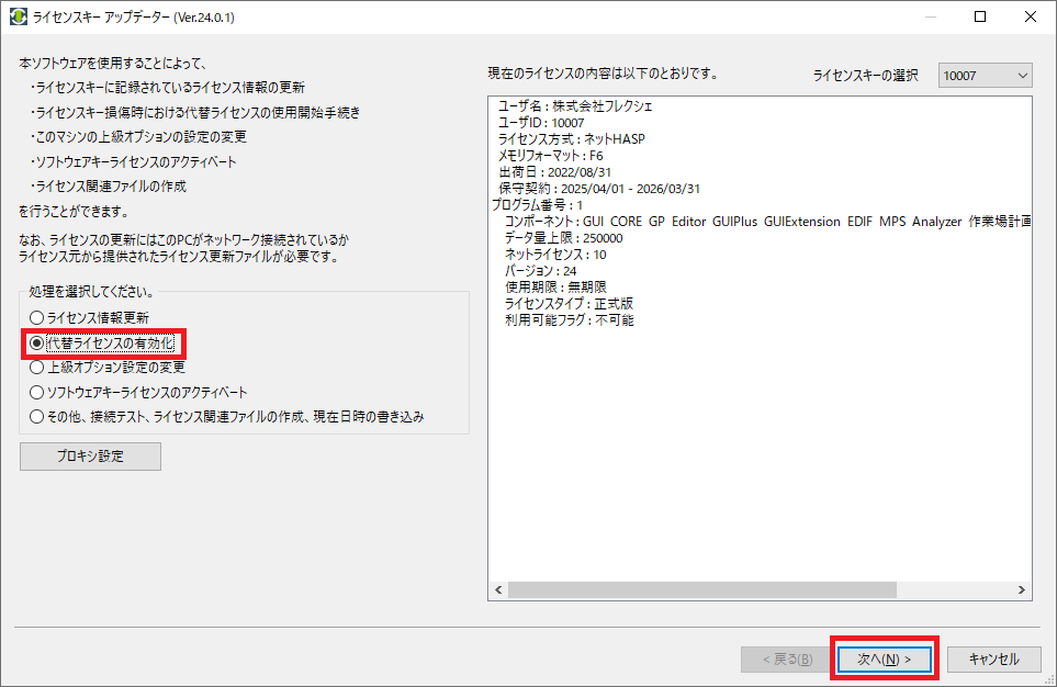 代替ライセンスキーが挿入されていれば、[代替ライセンスの有効化] が選択されています。選択されていることを確認して、[次へ] をクリックしてください。