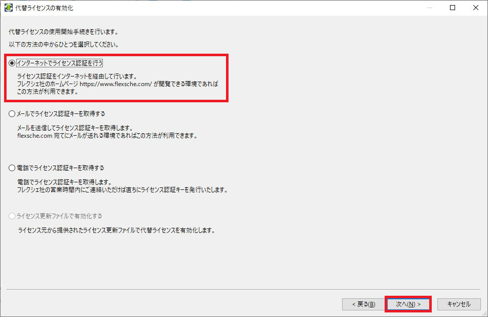 [インターネットでライセンス認証を行う]を選択し、[次へ]をクリックします