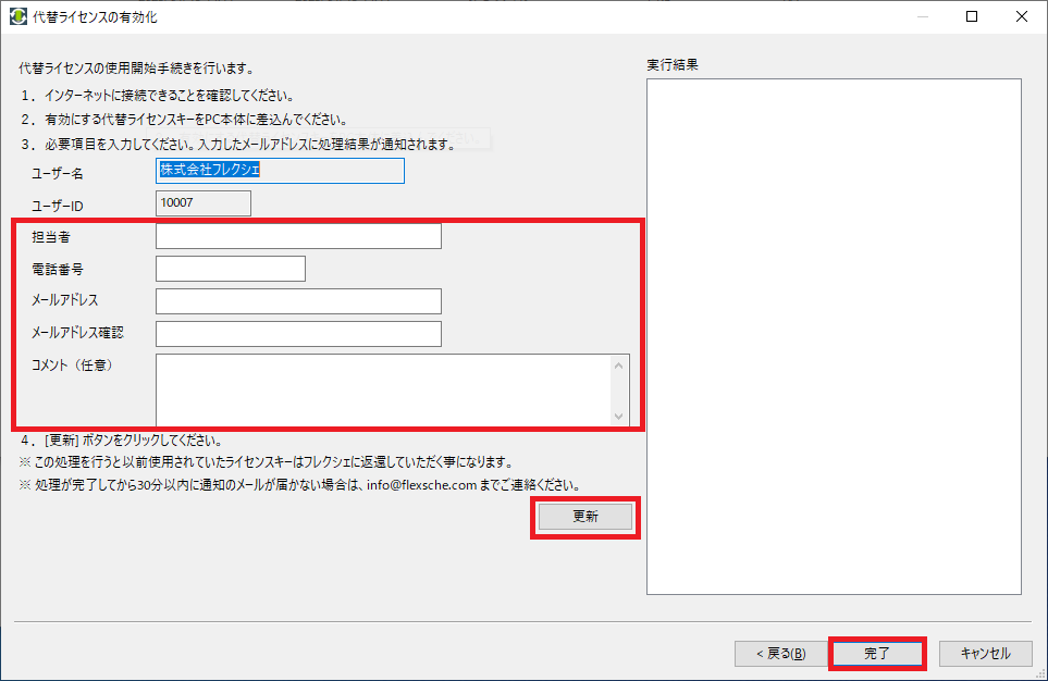 担当者の氏名・電話番号・メールアドレス・ コメント(任意)を入力し、[更新] ボタンをクリックしてください。 [完了]ボタンをクリックし、ライセンスキーアップデーターを終了します。更新手続きの案内メールがアドレス宛に送信されます。