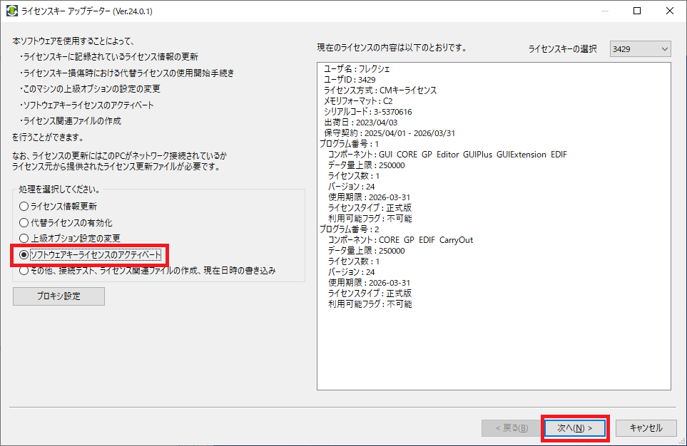 利用可能なライセンスキーが挿入されていれば、[ライセンス情報更新] が選択されているはずです。選択されていることを確認して、[次へ] をクリックしてください。