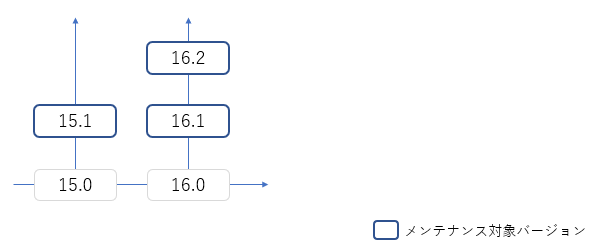 である場合、「最新バージョン」が17.0であるときには、「ひとつ前のバージョン」は16.2です。そして「前バージョンのひとつ前のメジャーバージョン」は15で、その最後のマイナーバージョンは15.1となるので、3つのメンテナンス対象バージョンは